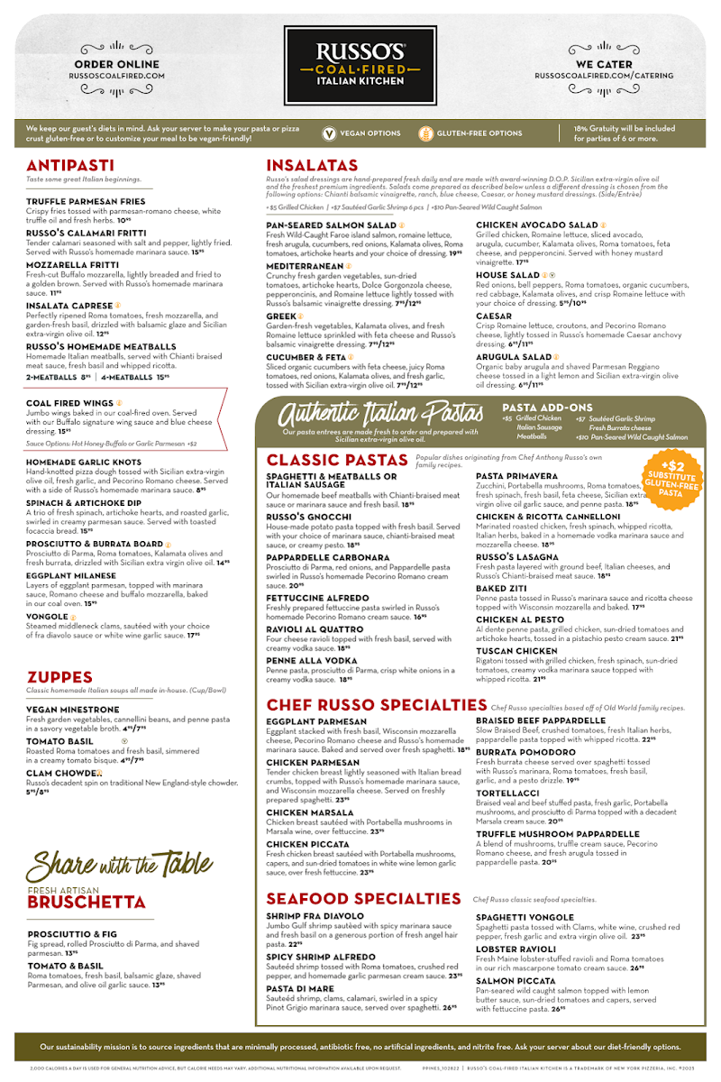Welcome to Russos Coal-Fired Italian Kitchen & Pizzeria located in Pembroke Pines, FL, where culinary dreams come to life. The menu is a treasure trove of authentic Italian flavors, spotlighting the star—an irresistibly smoky, coal-fired pizza that captivates hearts and palates alike.